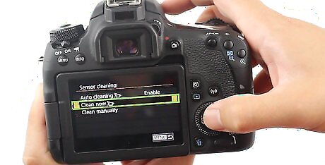 Remove the lens and flip down the mirror to expose the sensor. Unscrew the camera lens and set it aside. Then, go to the “Tools” menu on your camera and click the “Sensor Cleaning” option. Select “Manual Cleaning,” which will slide up the camera mirror and expose the sensor for you to clean. You can also try the camera’s built-in cleaning feature, if you haven’t already. Select “Clean sensor now,” in the Sensor Cleaning menu. The sensor will vibrate, dislodging some of the dust.