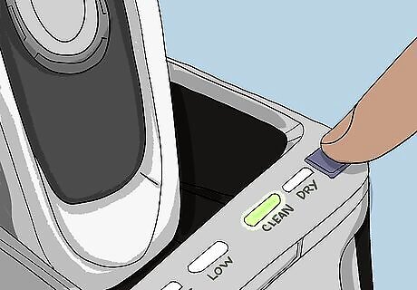 Activate the cleaning cycle. To begin, locate and push the button on the base that indicates the dock’s cleaning function. More advanced units may have several different cleaning options. In this case, you should select your preferred option. The different cleaning options will likely include a quick, normal and intensive setting. Each subsequent setting will offer a more thorough clean, but will also take longer to complete. In addition to cleaning the blades or foils, the dock will also typically apply a fresh coat of lubricating oil and rapidly dry the razor using an internal heat source.