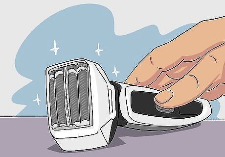 Remove the cutting head. The cutting head is the part of the razor that comes into contact with your face while shaving. This can usually be detached by simply pulling it straight off the frame, or by pressing a small latch on the front or back of the head. You’ll likely notice a lot of hair, skin particles and dust built up on both the inside and outside of the cutting head. Give the detached cutting head a light tap against the edge of your sink to remove hair clippings that have compacted inside. Just be careful not to damage the delicate blades or cutting foils, as these can easily be warped out of shape.