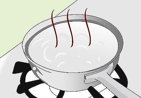 Immerse your Black Hills Gold in boiling water. If you’d rather not go to the trouble of scrubbing your jewelry with a toothbrush or cloth, you can simply immerse it in boiling water. Heat a saucepan full of water on your stove, and, once it’s boiling, gently immerse your jewelry into the water and let it boil for about 15 minutes. The boiling water will clean grease and oil from the jewelry. When removing the jewelry, be careful not to burn your fingers. Either let the water cool before grabbing the jewelry, or use a spoon to fish out the jewelry. Once the Black Hills Gold is cool enough to touch, use a clean, dry cloth to blot it clean.