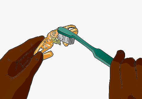 Scrub the Black Hills Gold with a soft toothbrush. Gently brush the surface of the jewelry to clean any grime, dirt, or oil off of its surface. Make sure that the jewelry is wet and soapy as you’re brushing it—otherwise it may not be completely cleaned. Brush both the inside and the outside surfaces of the jewelry, and focus on cleaning any areas that are visibly dirty. Make sure that the toothbrush you use is “Soft.” (You’ll be able to tell by reading the label on the toothbrush packaging.) A hard-bristled toothbrush may scratch or otherwise damage the surface of the Black Hills Gold.