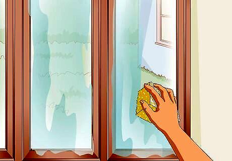 Wash your windows with soap and water. Remove any initial dirt or cobwebs with a hose and dish soap. Use a soft sponge so you don’t scratch the glass of your window. Wash your window quickly, since it is just an initial cleaning. If your windows are tall, a squeegee with an extender pole to reach the top.
