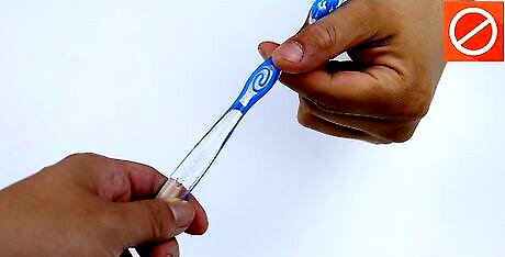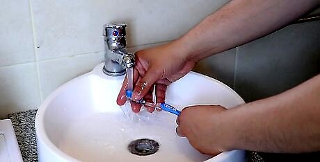 Rinse your toothbrush with tap water before and after brushing your teeth. This will help get rid of any toothpaste residue and rinse out any bacteria. It's not necessary to use cleaner on your toothbrush each time you use it. Simply turn the tap water on and run your brush under the water for a few seconds. Make sure to get any old toothpaste residue out of your brush before brushing your teeth again. You can use warm or cold tap water to rinse your toothbrush. Warm water may soften your toothbrush bristles and make them feel smoother when you brush.