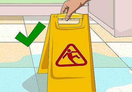 Alert passersby that the floor is wet. To prevent anyone walking through the area of vinyl composite tile you’re cleaning, put up a “wet floor” sign before you get started. Leave the sign up until the floor is dry. Do not allow people to walk over the wet vinyl composite floor.