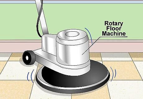 Machine-scrub the floor using a rotary floor machine. A rotary floor machine is a push-able machine with a large rotating pad beneath it. To use the machine, simply turn it on and push it forward as you would a stroller or shopping cart. The machine will do the rest. These machines might be available in stores as “floor machines,” “auto scrubbers,” “floor maintainers,” “floor cleaning machines,” or some similar formulation. The cleaning pad you equip your machine with depends on the degree to which your floor needs to be cleaned. You’ll probably use a blue or green pad meant for deeper scrubbing.