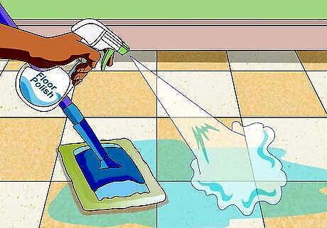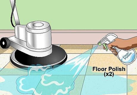 Polish the floor. Floor polish will protect your vinyl composition tile from abrasion. Specific directions for using floor polish vary depending on the product you opt to utilize. Generally, however, you can spray the vinyl composite floor with the polish, then spread it about using a damp or dry mop. Repeat this process three to five times. Consult manufacturer directions before using floor polish. Alternately, you could apply a sprayable buff solution to the vinyl composite tile. Spray the buff solution over the area you’re interested in polishing, then move the floor machine across the area you wish to polish.