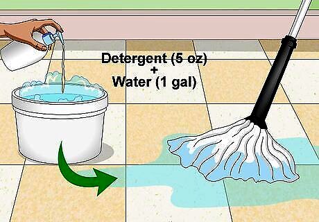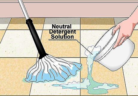 Mop the floor with a diluted neutral detergent solution. Directions for use vary by manufacturer, but generally, you should mix a particular volume of detergent with a given volume of water, then mop the floor using this mixture. For instance, your neutral detergent might recommend combining 5 fluid ounces (30 milliliters) of detergent with one gallon (3.78 liters) of water. Wring the mop out frequently as you clean. The mop should be damp, not saturated. After mopping the floor with the diluted neutral detergent solution, go over it once again with clean water to remove any film that might be left behind by the detergent solution.
