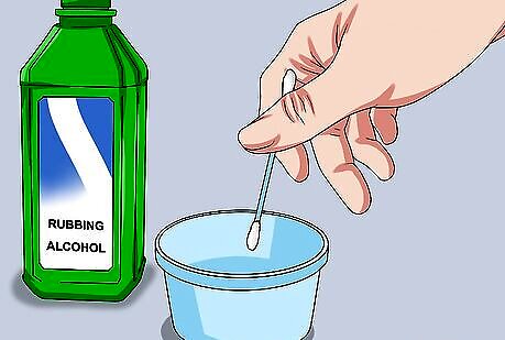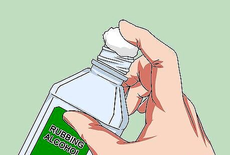 Wet a cotton ball with rubbing alcohol. Uncap the alcohol. Place the cotton ball on the opening of the bottle. Turn the bottle upside down for about a second and return it to its upright position. Replace the cap. If your alcohol is in a spray bottle, use about three squirts onto the surface of the cotton ball.