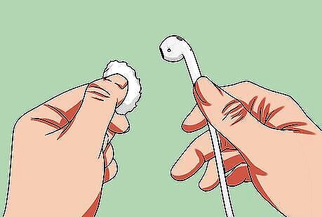 Wet a cotton swab with rubbing alcohol. Dip the swab into the alcohol. Move it around the plastic portion that goes in your ear. Allow the buds to air dry. This should take no longer than a few minutes. Be careful to avoid the mesh part. If too much liquid gets beneath the surface, it could damage your earbuds beyond repair.