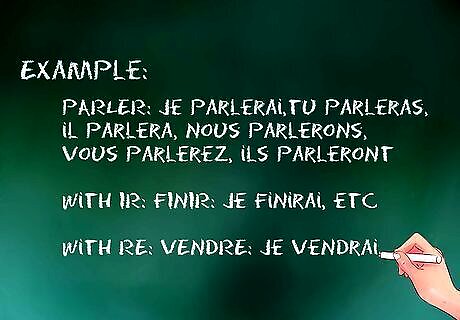 Add the endings to the infinitive form of the er or ir verbs. Remove the 'e' before appending the suffix to an '-re' verb. Example: PARLER: Je parlerai, tu parleras, il/elle/on parlera, nous parlerons, vous parlerez, ils/elles parleront With IR: FINIR: je finirai, tu finiras, il/elle/on finira, nous finirons, vous finirez, ils/elles finiront With RE: VENDRE: Je vendrai tu vendras, il/elle/on vendra, nous vendrons, vous vendrez, ils/elles vendront