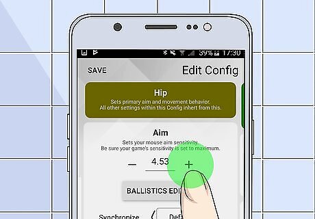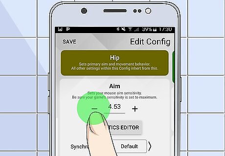 Adjust aiming sensitivity. Many games have a unique aiming sensitivity for both hip aiming and aiming down site (ADS). Tap the "+" and "-" next to "Hip" and "ADS" to adjust the aiming sensitivity. All changes are updated immediately, allowing you to fine-tune the settings.