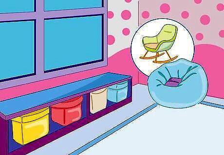 Add dead space. Empty floor space is crucial to allow your child a space to play and frolic. Your toddler will surely thank you. There are several ways to add dead space when converting a nursery into a toddler room. Remove rocking chairs or ottomans you may have used to rock your baby to sleep. Relocate the diaper pail. Swap it with a storage basket for toys and games. Remove chairs and swings that you used in the nursery, as well as toys or objects that your toddler is no longer interested in. Add a beanbag chair or a soft child’s chair to the toddler room. Draw a plan showing where you’d like everything to go before you start rearranging your toddler’s room.