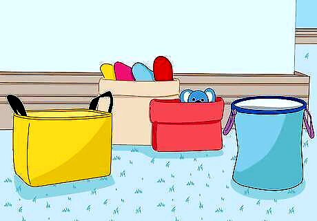 Add plenty of bins and baskets. Low-lying plastic bins are perfect for stashing your toddler’s toys and games. If you’re unusually orderly, you could get bins and baskets of different colors and insist that your child uses different colored bins for different purposes. For instance, you might ask your toddler to put all the blocks in the red bin, all the trains in the blue bin, and so on.