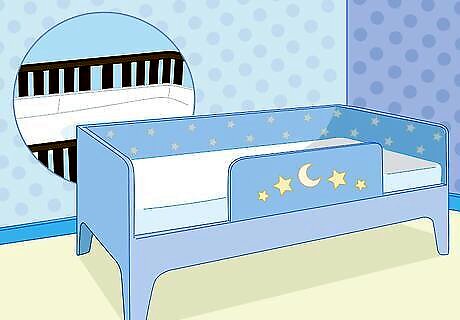 Add a toddler bed. You might need to trade the crib for a toddler bed when your child is as young as 12 months old. Generally, your child will be ready for a bed when they are 18 months old or older. You’ll know when your child is ready for a toddler bed when you hear or see them climbing out of their own crib. If your crib has the option of converting into a bed – for instance, by lowering one side of the crib rails – you won’t need to invest in a separate bed. Simply follow manufacturer instructions and remove the toddler rail. Before changing your convertible crib into a bed, make sure that your particular model meets current safety standards and has not been recalled. In the U.S., you can do this by checking the Consumer Product Safety Commission website at https://cpsc.gov/. If you don’t have a convertible crib, you’ll need to invest in a toddler bed. Unlike cribs, toddler beds are small and low to the ground, allowing your child to get in and out of bed on their own. A toddler bed is acceptable until your child is about 4 or 5 years of age. If you have other, younger children, you can keep the toddler bed and pass it on to them when your toddler outgrows it.