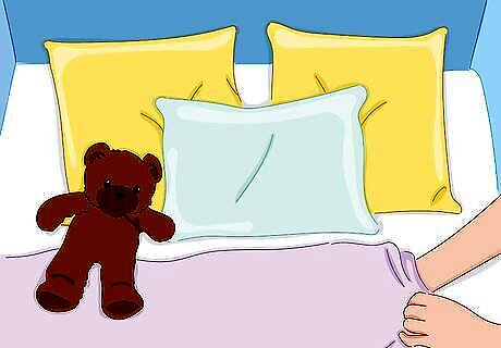 Add some toddler bedding. Toddler beds, like normal beds, require sheets, pillows, and blankets. You can obtain these items online or in many home and bedroom stores. Take your child with you to the home good store and allow them to select a set of sheets they like. Your child might be interested in sheets that are blue, yellow, or multicolored. Sheets with popular animated characters might also be of interest to your child. Direct your child to various sheet and comforter sets to help them make a decision that will get them excited about their room and their bedtime. Add some small stuffed animals to your child’s bed. You could give your child a personalized pillow with their name on it. Ensure your toddler bedding is made of soft, nontoxic, non-flammable material. Check the bedding’s packaging to determine if it is or is not made of appropriate materials.