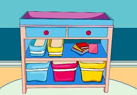 Find a new use for the changing table. If your toddler is potty trained, you will have no more use for diapers. Use the many drawers and shelves in the changing table for your child’s toys, books, clothes, and games. If your changing table is too large or bulky and wouldn’t be accessible for your child, remove it and add a more appropriately-sized chest or table to the room. Alternately, you could swap the changing table entirely and add, for instance, a plastic table and chair set to your child’s room. This will give your toddler somewhere to play. Ensure all furniture is safely attached to the wall using the wall hooks provided to you by the manufacturer. This will prevent your toddler from pulling the furniture over onto their tiny body.