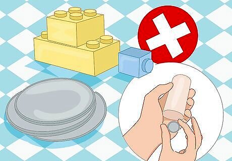 Remove choking hazards from the room. Toddlers put almost anything they can find in their mouths. For this reason, remove small coins, toys that might get lodged in the throat, and similar objects. Anything that can fit inside a toilet paper roll does not belong in your toddler’s room. Check toys for removable or fragile parts that might break off.