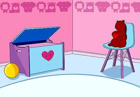 Decorate your toddler room. There are many ways to decorate your child’s toddler room. Obtain some whimsical and kid-friendly art to amuse and stimulate your child’s mind. For instance, your child might enjoy an image of a happy monkey or similar beast. Other toddler rooms have walls covered in brightly colored abstract art. You can also paint directly onto the walls. For instance, some people like to paint trees or birds onto their walls. Some toddler rooms feature more classically-inspired murals that excite the eye. Try hanging some family photos on the wall of your toddler room. Make sure the frames are securely mounted well out of your toddler’s reach. Select frames that use shatter-proof acrylic glass, or remove the glass altogether. Make sure that all decorative items are made with non-toxic materials and free of small decor that can easily break off. Avoid alphabet charts and similar decorations that are geared towards babies. In the past, many people chose pink walls if their child was a girl and blue walls if their child was a boy. However, this is no longer preferred.
