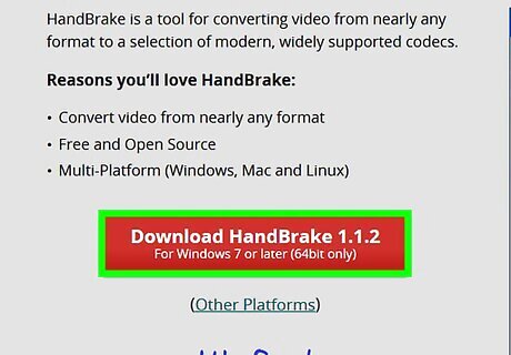 Download the HandBrake setup file. Go to https://handbrake.fr/ in your computer's web browser and then click the red Download HandBrake button in the middle of the page. The setup file will download onto your computer. Depending on your browser's settings, you may have to select a save location or confirm the download before proceeding. HandBrake is a free program for Windows and Mac computers.