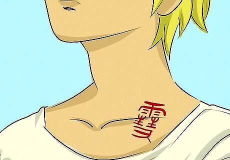 Wear his tattoo. Yukine has a red tattoo on his lower neck meaning snow. Use red face paint to carefully draw on the tattoo, you can also ask someone for help if necessary. Yukine's tattoo can be purchased from an online cosplay shop as well.