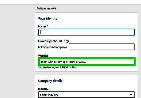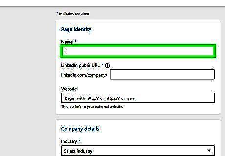 Enter your companies name. Use the bar labeled "Name" at the top of the page to type the name of your company. When you provide the name of your company, a public URL for your company's LinkedIn page is created below the "Name" box. If you wish to use a different public URL, use this line to edit it.