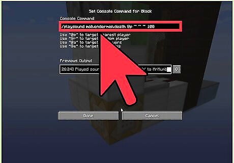 Place a command block under the block you placed in Step 4 in Part 1. Then insert the command /playsound mob.enderman.death @p ~ ~ ~ 100. This will make an incredibly horrifying noise!