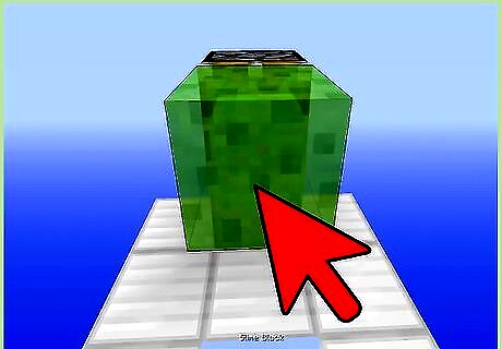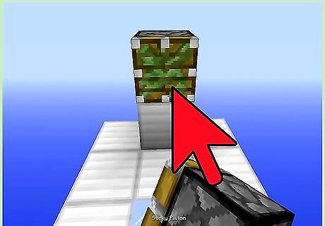 At the back, place a block, a sticky piston facing towards you, and a slime block on the sticky piston. Then destroy the block below the piston.