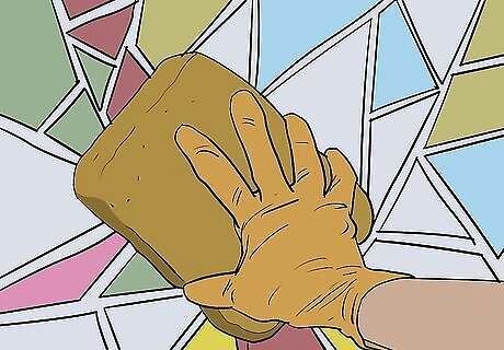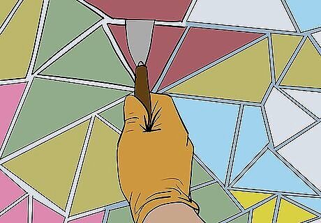 Apply grout to cracks between crockery shards after the mortar has cured completely. This usually is after 72 hours.