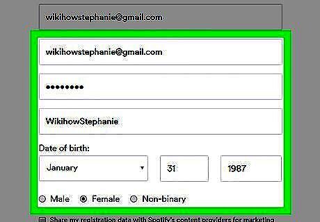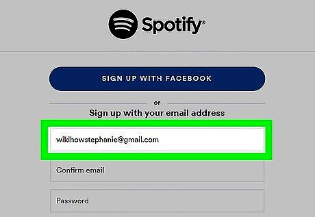 Enter your email address in the Email field. If you want to sign up without a Facebook account, you will need to use your personal email address to create a new Spotify account. If you don't already have a personal email address, you can create a new email account at Google, Yahoo, or Microsoft Live.