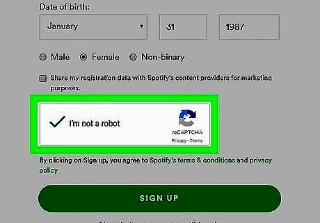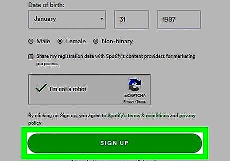 Click SIGN UP. This is the green button at the bottom of the sign-up page. It will create your new Spotify account. You can now sign into the mobile or desktop app with your new account.