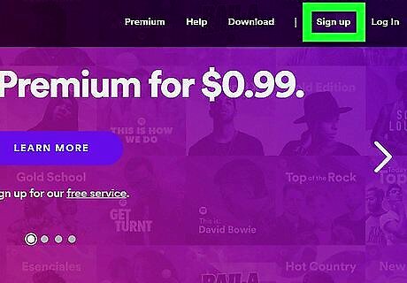 Click Sign up. This button will be in the upper-right corner of the Spotify Home page on your browser. It will redirect you to a sign-up form.
