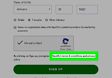 Read Spotify's terms & conditions and privacy policy. You can open these documents from the green links above the SIGN UP button.
