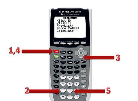 Make sure that X-list is selected. X-list should already be selected and awaiting a list of data once under "4:LinReg(ax+b)". This is where you will input your X values, or L1 data values. Press the 2ND button and then the 1 button. This should make L1 appear next to the colons. Press the down arrow once and then Y-list should be highlighted. Press the 2ND button and then the 2 button. This should make the L2 value appear next to those colons.