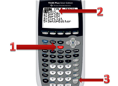 Press the STAT button on the calculator. EDIT should appear at the top of your calculator's screen and "1: Edit" should then be highlighted. Press ENTER at the bottom right-hand corner of the calculator.