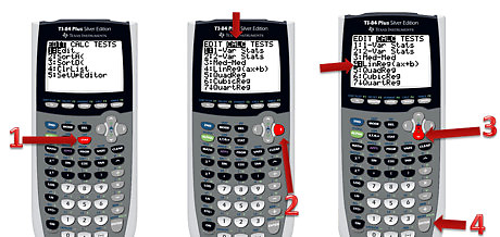 Press the STAT button again. Press the right arrow until "CALC" is highlighted on the top of your calculator's screen. Press the down arrow 3 times until "4: LinReg(ax+b)" is highlighted and then press the ENTER button.