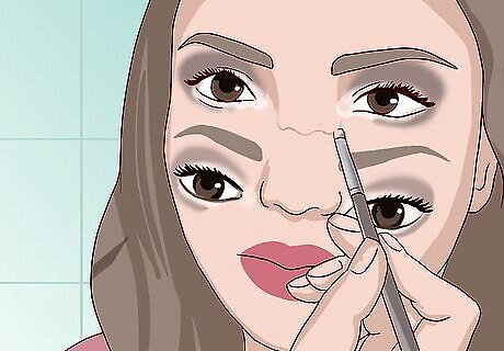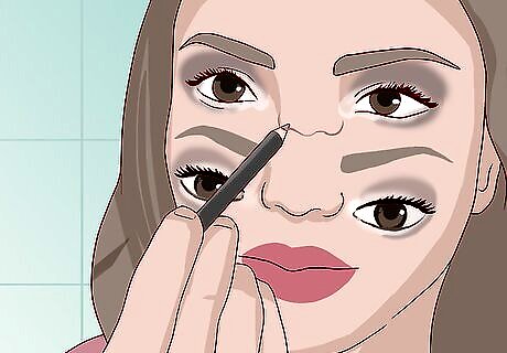 Sketch the shape of your new nose with eyeliner. Use a pencil eyeliner in a tan or brown color, depending on the color of your skin. You don’t need to be Picasso and create a freakishly realistic nose. Instead, just recreate the shape of your natural nose as you look at it straight on. Your outline will probably only consist of a few curves, where your natural nose curves from nostril to tip. Observe how your nostrils poke out on the sides, and create that same shape with your eyeliner, extending upwards slightly.
