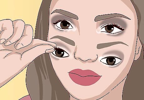 Glue false lashes on your fake eyes. This step takes your fake eyes from cool to downright trippy. Pick up a pair of full, fake lashes from a local pharmacy or beauty supply store. Apply lash glue along the band of the lashes, letting it dry until it’s tacky. Then, place your fake lashes onto the top border of your fake eyes. Make sure to hold the lashes down for a couple of seconds to make sure they dry securely on your skin. Be careful not to touch your face at all while you’re wearing this look. If you touch your cheeks out of habit, you can smear your carefully constructed fake eyes. Add a row of bottom lashes by just drawing lines extending from the bottom lash line in eyeliner.