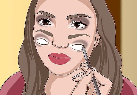 Draw your fake eyes below these brows. Observe your own eyes carefully, and recreate the shape of your eyes with eyeliner. They should be basically parallel with your nostrils. Once you’ve created the outline of your new eyes, brush eyeshadow over the top. Begin by applying the eyeshadow right on the outer border of your eye outline, blending it upwards – just like on your natural lids. Once you’ve applied the eyeshadow, use your darker eyeliner to draw a fake “crease” in it. This will make your shadow look more like three-dimensional eyelids.