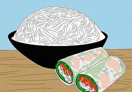 Use Vietnamese rice noodles. Perfect for spring roll wrappers or lettuce, rice noodles are low in calorie and filling. Toss 1/2 cup of cooked rice noodles with your favorite Asian dressing or sauce. Divide the rice noodles in half and layer each half into a butter lettuce leaf. Top each lettuce leaf with 1/4 cup of cooked ground pork seasoned with salt and pepper. If desired, top your lettuce wraps with 1 – 2 tablespoons shredded carrots, a few leaves of cilantro and a sprinkling of toasted sesame seeds.