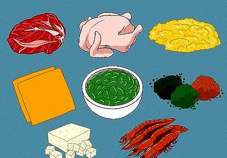 Select a source of lean protein. Protein is an essential nutrient to include at each meal. Always aim to have 3 – 4 oz of protein in every wrap. Plus, it'll help keep you feeling satisfied throughout the day. Choose a lean protein to add to your wrap to manage your overall calories. You can try: Poultry and red meat. These are the most common wrap fillings. Choose all natural and low-sodium deli meat, sliced chicken or turkey or lean red meat. They will typically have fewer additives and sodium. Choose three to four slices of deli meat or a piece of meat the size of your palm. Scrambled eggs. If you're feeling like a little breakfast, try adding scrambled or hard boiled eggs to your wrap. They're high in protein and healthy fats. One to two eggs will meet your 3-4 oz serving size. Sliced cheese. If you're avoiding meat or just want to change it up a bit, try adding some sliced cheese to your wrap. It's another great source of protein and also high in calcium. Aim for two to three slices. Beans or lentils. If you want to skip the meat, try filling your wrap with 1/2 cup of beans or lentils. They're not only high in protein, but also high in fiber. Tofu or tempeh. Another great vegetarian source of protein is tofu and tempeh. Both made from soy beans, they're a great alternative to meat. Slice up 3 – 4 oz or a block about the size of your palm. Seafood. Besides tuna salad, you can add grilled fish or seafood to your wrap. They're still high in protein and some seafood (like salmon) are also high in heart healthy fats. Measure out 1/2 cup of tuna salad or 3-4 oz.