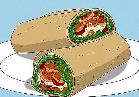 Select your type of wrap. When you're making a wrap, there are a variety of items you can use to wrap up your tasty ingredients. Try to keep calories to 100 – 180 calories per item so your entire wrap doesn't get too high in calories. Mix it up and experiment with all the different ways you can wrap your food. You can try: Tortillas or wraps. These are the traditional wraps used in these types of recipes. They are very thin bread generally made from either corn or wheat. Try to go for 100% whole wheat or whole grain as these tortillas/wraps will have more fiber and protein. Flatbreads or lavash bread. Both of these are similar to tortillas, but may be slightly larger or thicker. Again, choose 100% whole wheat or whole grain items. Pita bread. Pita bread can not only be stuffed with ingredients, but can also be used to wrap items too. Whole grain is the preferable choice here as well. Lettuce. If you're looking to watch calories or your total carbs, consider using lettuce as a wrap. It's crunchy and naturally low in calories and carb-free. Try butter lettuce, iceberg lettuce, kale, Swiss chard or romaine lettuces. Spring roll wrappers. These are also low in calories and carbohydrates. It may take some practice to use them, but they offer a fun twist on your traditional wrap. Seaweed. Just like with sushi, you can use sheets of seaweed as a wrap too. Plus, seaweed has a variety of benefits, including fiber, minerals, and phytonutrients.