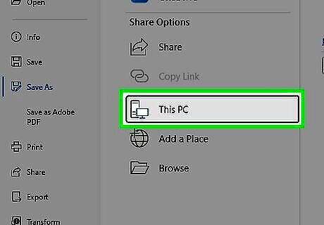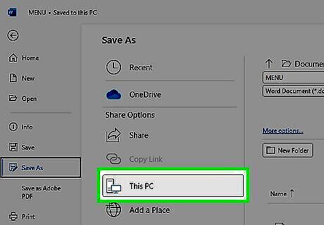 Click This PC on Windows. Templates need to be saved in the Custom Office Templates folder on your computer. It may not work if you save it to a cloud service, such as OneDrive or iCloud. If you're using a Mac, select the Where box and choose a save location. Otherwise, it will be saved in the Templates folder.