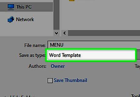 Click the drop-down menu and select Word Template. This is in the Save as type drop-down menu. This changes the file type to the Word Template format. If your document has macros, you'll need to select Word Macro-Enabled Document instead. Alternatively, you can select "Word 97-2003 Template" if you plan on using the template in an earlier version of Word.