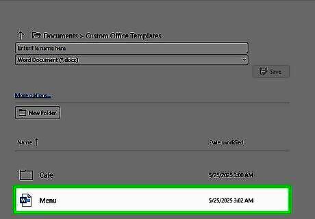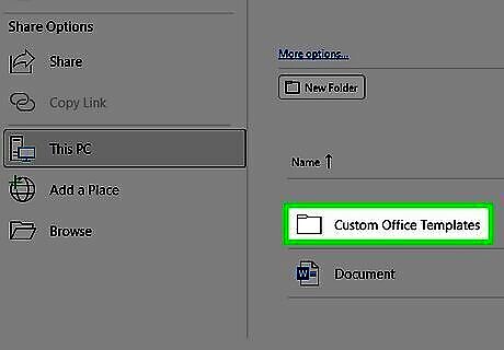 Go to the "Templates" folder. Any templates you've created will be in this folder. The folder location will vary depending on your device. On Windows: Go to This PC/Documents/Custom Office Templates. On Mac: Go to /Users/username/Library/Group Containers/UBF8T346G9.Office/User Content/Templates.