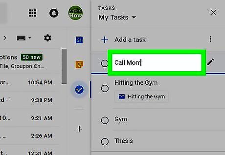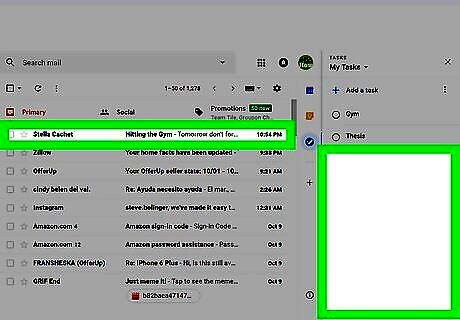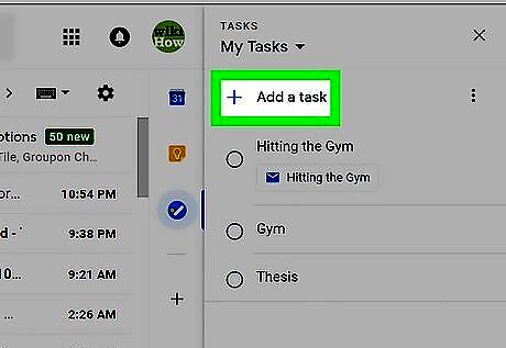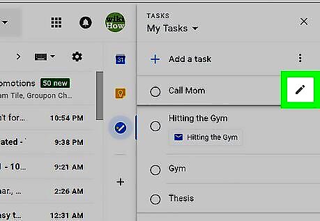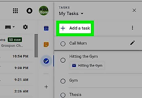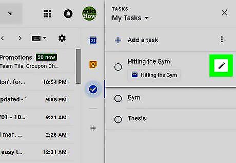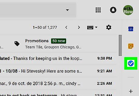 Click the Tasks button. It's in the icon bar that runs along the right side of the inbox. Look for a round blue icon containing a diagonal white line and orange dot. If you already have a Tasks list, the list will appear. If you've created multiple Tasks lists and want to save an email to a specific one, click the drop-down menu at the top of the right column, and then select a list. If it's your first time using Tasks, click the blue Get started button in the right column to continue.