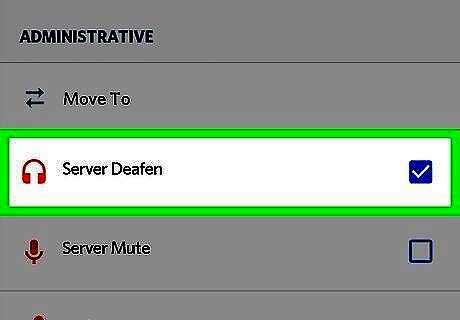 It’s under the “Administrative” header. This member will no longer be able to hear voice conversations on any voice channel on this server. You can deafen additional users by checking the “deafen” box on their User Settings panels.