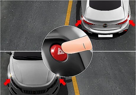 Indicate to other drivers that something is wrong. Use your emergency lights to notify the cars around you that something is wrong. They may have heard or seen the tire blowout, but if they haven’t, your emergency lights will alert them to the fact that you’re driving slower and need extra caution.