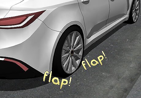Listen for telltale signs. There are three sounds associated with tire blowouts, and they happen in quick succession. First, you’ll hear a loud boom, shortly followed by a whooshing sound as the air rushes out of your tire. When the air has left, you’ll hear a flapping sound, which is the sound of your tire hitting the road.