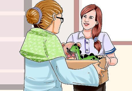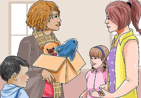 Give the toys away to friends or family with children. You can also give away some of the toys to friends or family who have children. Offer the toys to them, particularly toys that are age appropriate for their kids. If you have a friend who does not have many toys for their children, you may offer some of the toys to them. Suggest that your child assist you in giving away the toys to others who are less fortunate or who do not have access to toys. This can help to teach them the value of being generous and letting go of material things. You can read books about the act of giving with your child, like Too Many Toys by David Shannon.