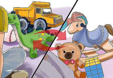 Rotate the toys. Another option is to rotate the toys so your child has access to a few toys at a time and gets to play with new toys on a regular basis. You may rotate their toys once a week or once a month. Set aside a certain amount of toys for play every week and keep the rest in storage. Then, change out the toys the following week. This way, your home is not overrun with toys and you can control how many toys your child has access to at once. If your child gets attached to a certain toy, allow them to keep playing with the same toy and rotate the other toys out. Try to keep it to only one favorite toy at a time. Otherwise, you may end up having too many “favorite” toys out at once.